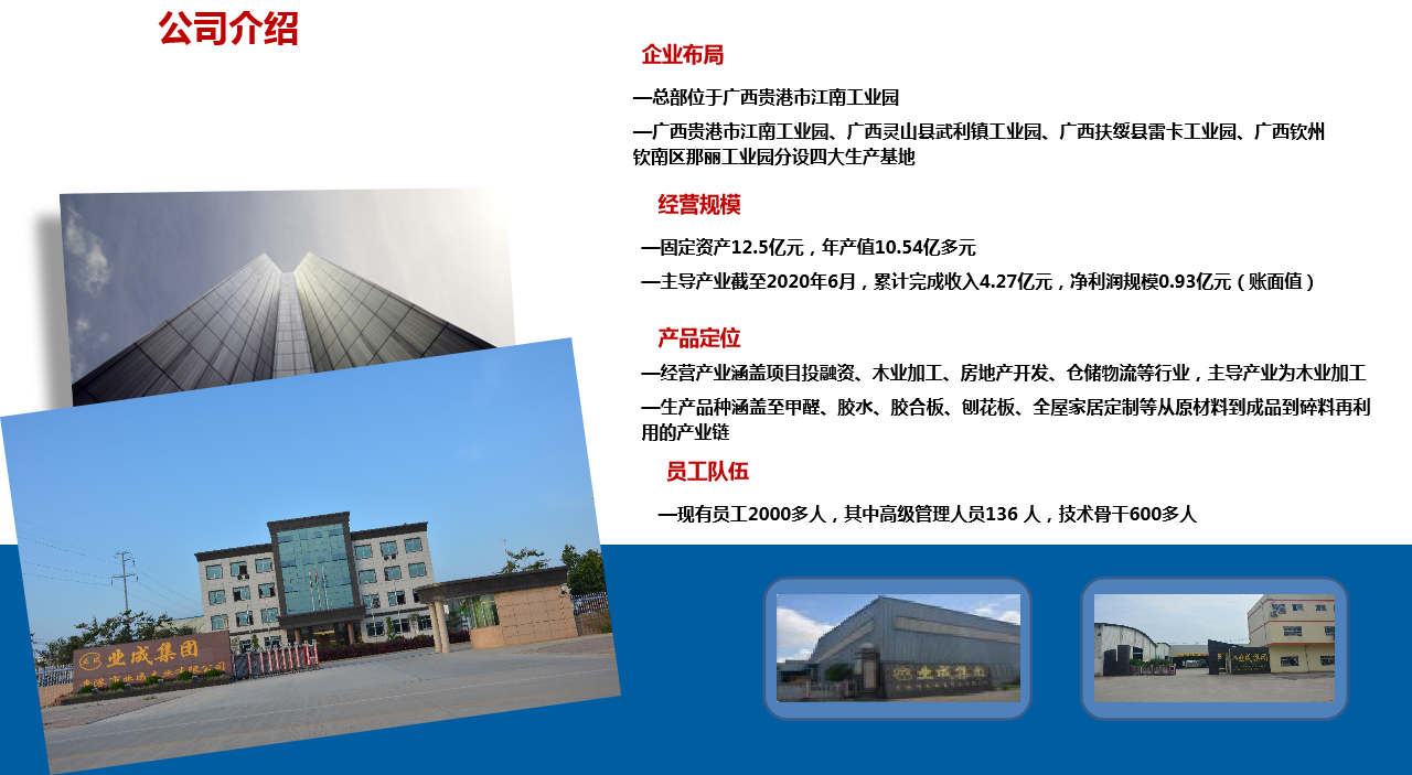 安博网页版登录入口-安博(中国) (以下简称:业成集团)成立于2013年7月,总部设在广西贵港市江南工业园,两大生产基地分布在广西贵港市江南工业园、广西灵山县武利镇木业产业园,员工2000多人,固定资产12.5亿元,年产值10亿多元,经营产业涵盖项目投融资、木业加工、房地产开发、仓储物流等行业,主导产业为木业加工。...